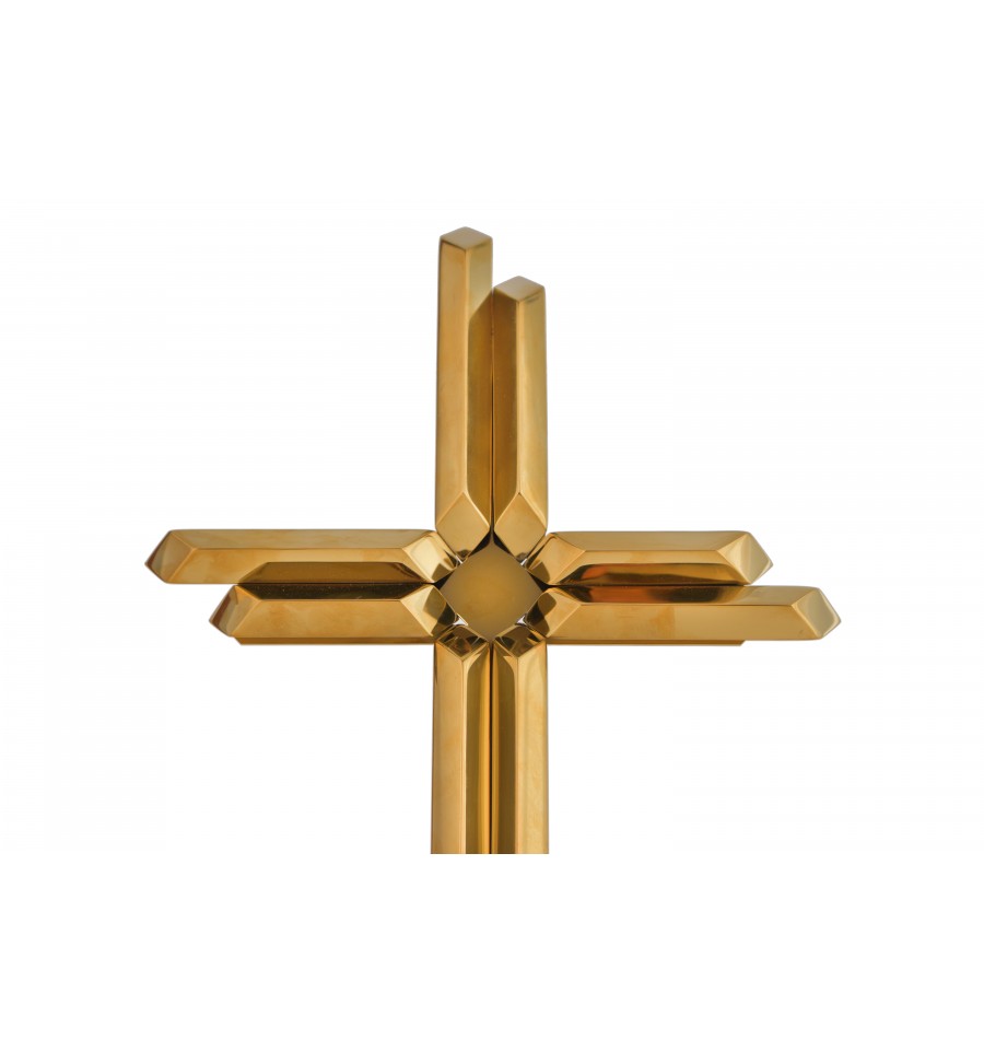 Krzyż przestrzenny, wiszący wykonany z kwasówki, polerowany. Kolor uzyskiwany jest poprzez reakcje chemiczną, która wchodzi wgłąb materiału. Dzięki temu kolor nie łuszczy się, nie schodzi oraz w momencie porysowania nie widać koloru srebrnego.